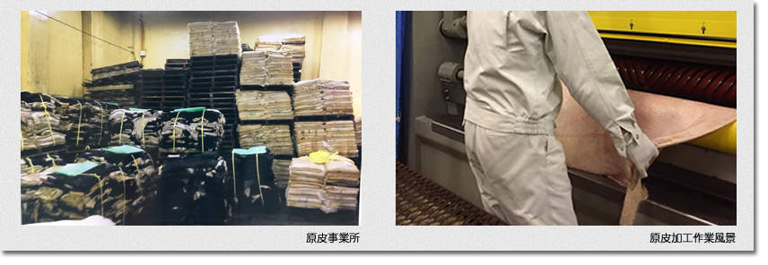 東鷹栖事業所では、昭和初期の頃より手掛けております畜産副産物である牛生皮、豚生皮を全道各地より集荷し1次加工をしています。1次加工も昔は熟練した職人が手作業で1枚1枚加工していたものが昭和の後期になると国産加工機械が開発されいち早く導入しました。現在は、皮製品の本場イタリア製の加工機械が導入されております。
