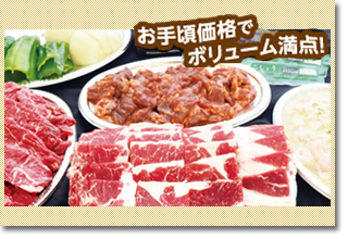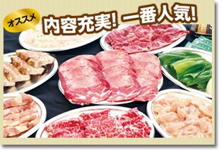 | 牛カルビー・味付牛はらみ・牛舌・塩ホルモン・豚丼風豚バラ・味付牛ミノ・やきとり・野菜・つけだれ・塩こしょう |